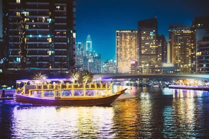 Cena y entretenimiento navegando por las aguas de Dubái.